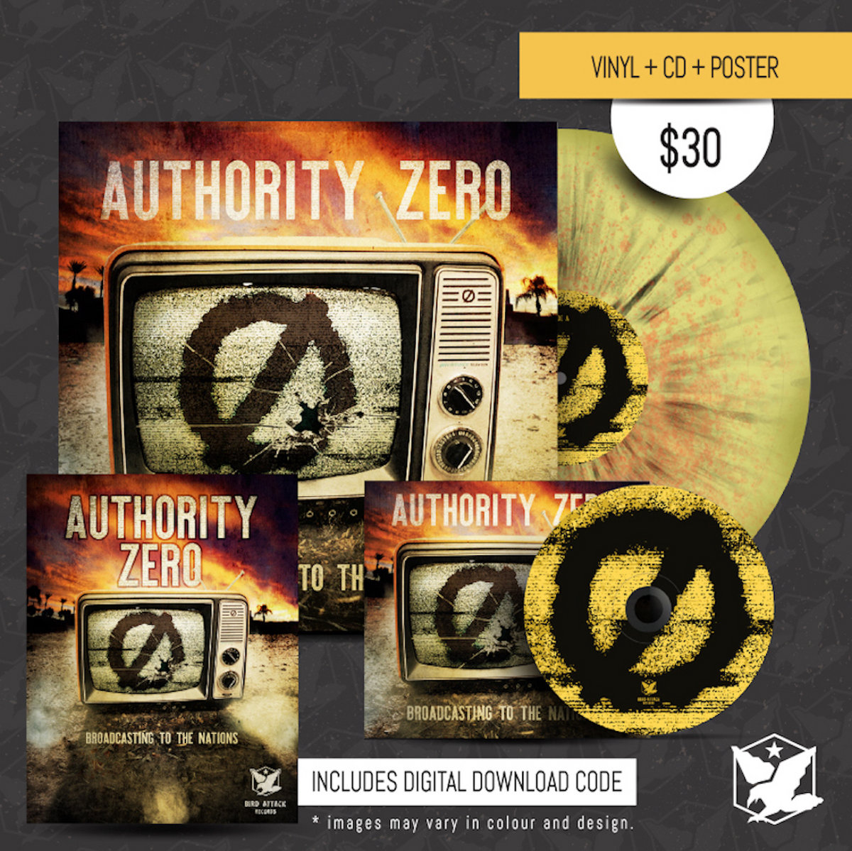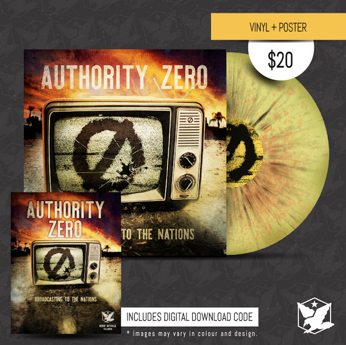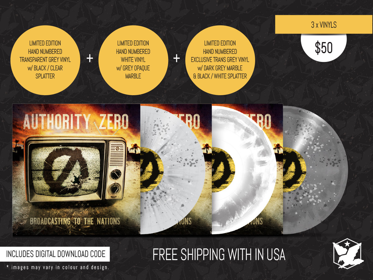 Authority Zero Broadcasting + Album Cover Shirt + Splattered Vinyl + CD + Poster