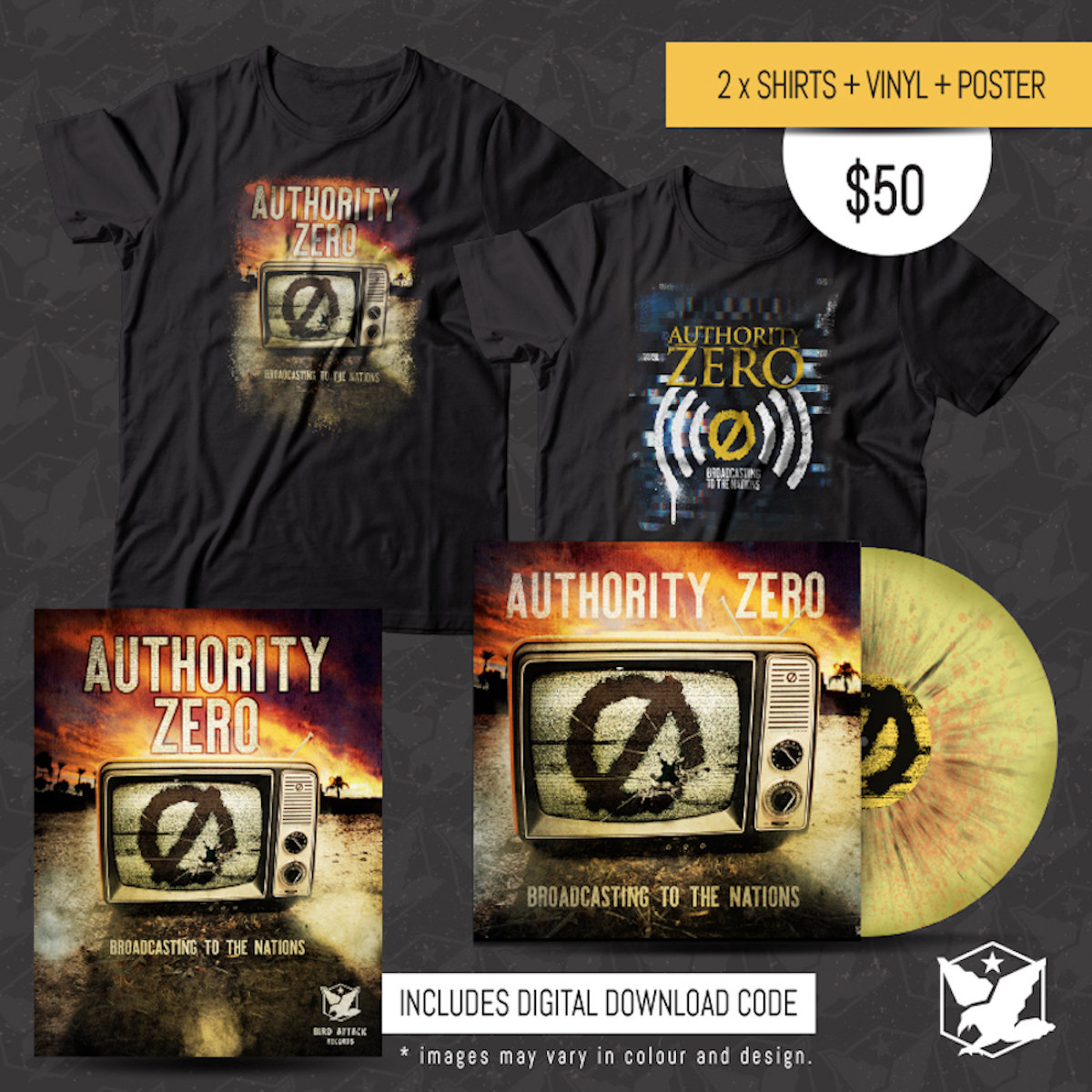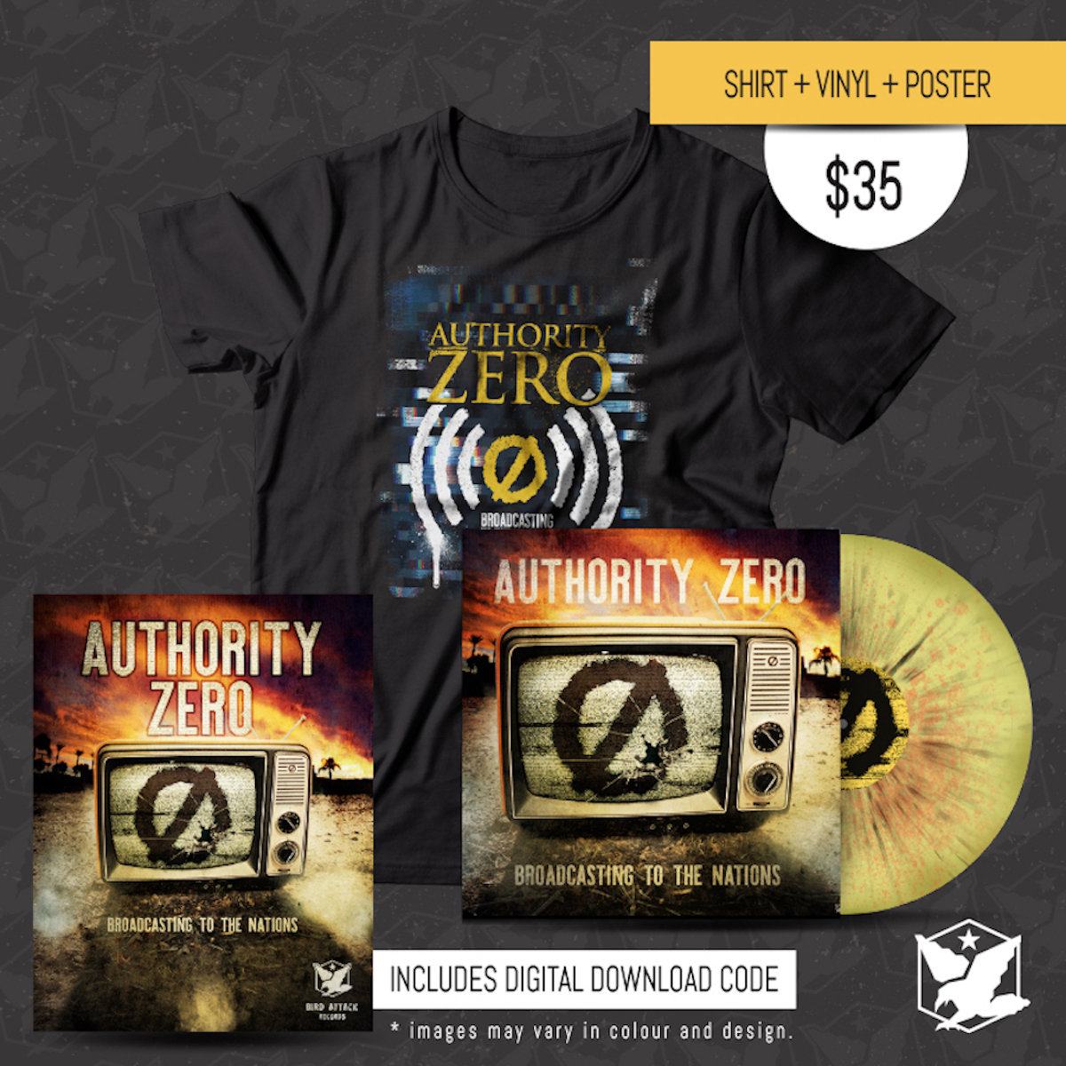 Authority Zero Broadcasting Shirt + Poster + Splattered Vinyl